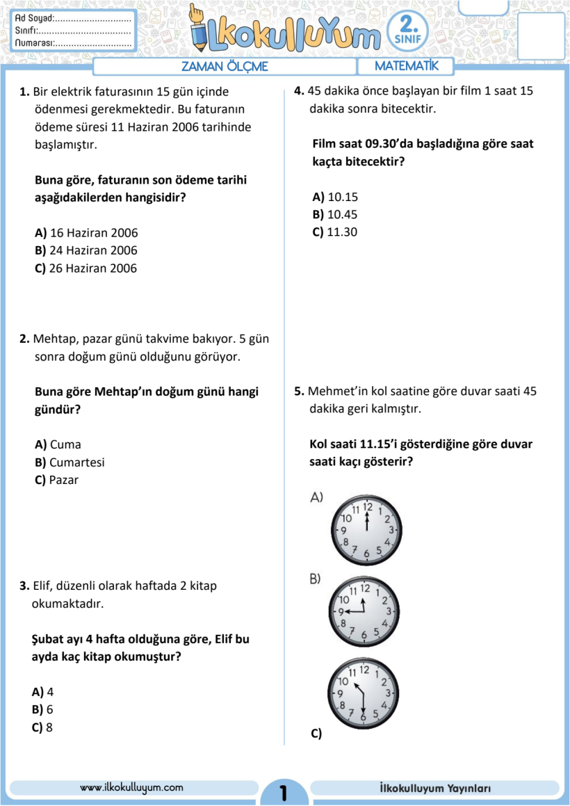 2. Sınıf Zaman Ölçme