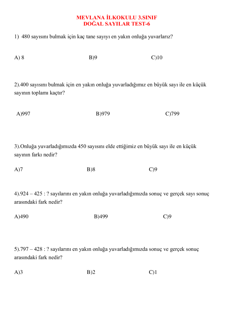 3.Sınıf Doğal Sayılar Genel Değerlendirme Çalışması (Süreç Değerlendirme)